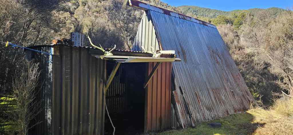 Gourmet lunch, snacks and the Jetboil in the pack. Excitement through the roof. The morning was stunning. The track followed above the stream and into the catchment, winding gently until the bush thickened. Hearing the soft trickle of water below us, we instinctively slipped into stalking mode. Fresh sign appeared. No wind. Everything was aligning. Then: the clearing. The “front lawn” of the old biv. The Bivvy Weathered. Open. Two bunks. A hut only the hardiest would choose to stay in — exactly the type of place with character stitched into its bones. We ate an early lunch in the sun, stripping off layers. From here, we were all-in on hunting mode. And it was clear why the bivvy was built where it was: grassy clearings, beech forest, open stream edges, big hills — a deer paradise. Then — crash! Splash! Something bolted along the river rocks right beside us. A sigh escaped both of us. Probably winded us. From then on, we were silent. Ghosts. For hours we moved like shadows, climbing steadily up the ridge, deeper into mature beech. We hit 1000m without realising — the day was so still and blue you couldn’t feel the altitude. Then a loud territorial call shattered the quiet — only 100m away. I hit the ground. Chris froze ahead of me. He later told me he’d seen the stag. The animal bolted but stopped to call again — seemingly talking to another stag. For 20 minutes they vocalised back and forth before disappearing. A very cool encounter — unusual for August. Less aggression than the roar, more like two deer trying to reunite. High Point Reward We continued on to our high point and were rewarded with an unbelievable afternoon tea spot — a clay outcrop with steep drop-offs on every side. Jetboil on. Silence, sun, views forever. It felt like we might be the only two humans ever to sit there. But the day wasn’t over. A big descent and climb remained. The downhill was hectic — wet, slippery, unseen by sun. Ferns, debris, steep terrain. Uphill was hand-over-hand, Fiordland-style grunt work. No trails. No animal tracks. Just the path of least resistance. Eventually, a faded strip of pink electrical tape appeared — a blessed sign of marked route. We knew this was the beginning of “home territory.” We fist-pumped — again. Circuit complete. Hut-bound, nearly dark, fire glowing. A day of highs, lows, and everything in between. These are the missions that stay with you.
